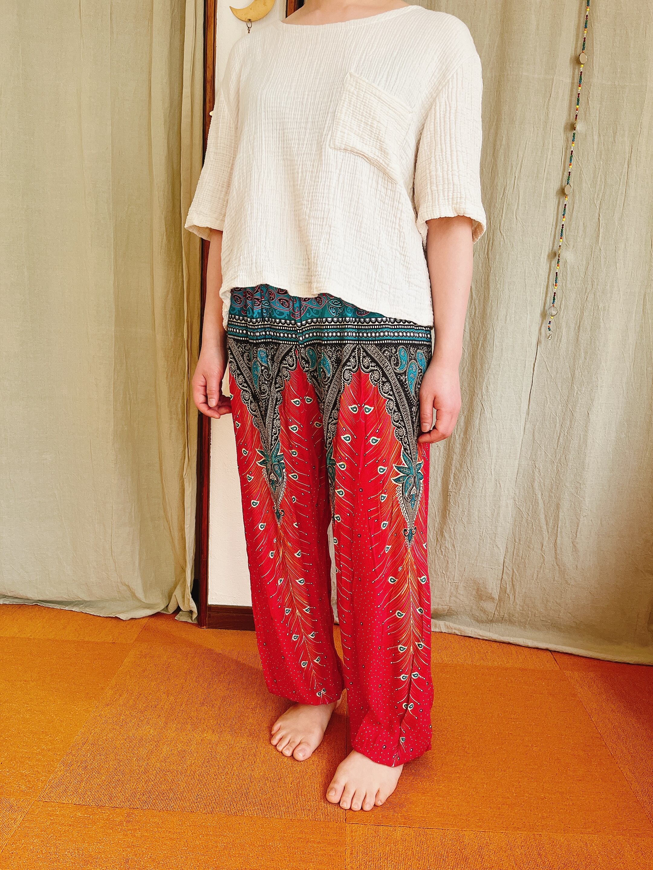 伝統的なタイのデザインを取り入れたこのパンツは、カジュアルからきれいめのコーディネートまで幅広く活躍してくれます。タイパンツならではの涼しげな印象で、夏のお出かけスタイルにもピッタリです。